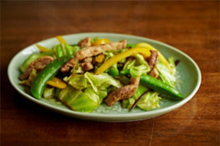 【1】Slice the pork into 1.5 cm widths. Cut the cabbage into bite-size pieces and the bell pepper into thin strips. Remove the stems and strings from the snap peas.