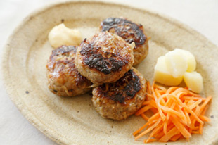 【3】Heat the oil in a frying pan and fry the patties over medium heat. Flip them over after they turn brown. Once browned on both sides, add 80 cc water, cover with a lid, and cook until all the water is gone.