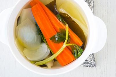 Cut the carrot lengthwise into halves and peel the onion. Place all the ingredients in a pan and cook over very low heat for about 40 minutes. Remove the vegetables and kombu.