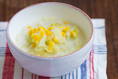 <Soymilk soup with napa cabbage and corn>