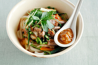 【3】Boil the udon as indicated on the package. Dish up, pour on the stew from Step 1, and sprinkle with the vegetables from Step 2. Finally, add the shoyu koji. Blend it in as you eat.