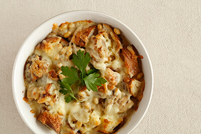 <Gratin de pain with chicken and soybean stew>