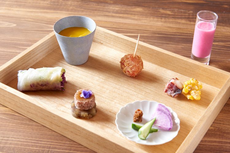 The appetizers on the day of our visit included (starting from the top left and moving clockwise) pumpkin and salted koji ground soup, beetroot potato croquettes, corn and octopus rice flour fritters, vegetables with homemade miso, eggplant and seasoned ground beef in a savory miso gelée, and spring rolls with avocado and soy sauce koji chicken.