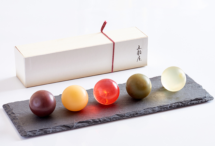 One of Gokokuya’s more popular products is Itsuki. The product, whose name literally means five seasons, represents the five seasons — spring, summer, autumn, winter, and the doyo transition period referring to the 18 days before each season based on the traditional Japanese calendar — with five yokan [sweet bean jelly] pieces, each a different vibrant color. The five flavors are created with the five fundamental fermented seasonings — namely, saké, salted koji, vinegar, soy sauce, and miso. The spherical shape of the jellies creates an adorable visual impression.