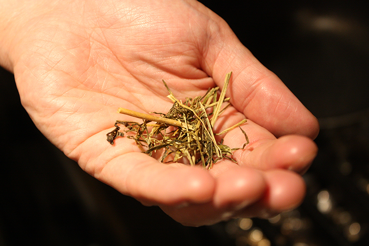 Skotse is a herb produced by crushing a plant known as Himalayan chives in a stone mill and squeezing out all the moisture, then drying it. It’s tempered — that is, heated in oil to release the aroma — before being used. You can think of it as basically the same dry herb as the jimbu used in dal in Nepali cooking.