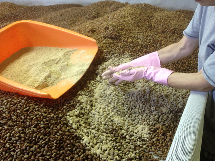 The process of inoculating the koji mold in the steamed soybeans is done carefully by hand