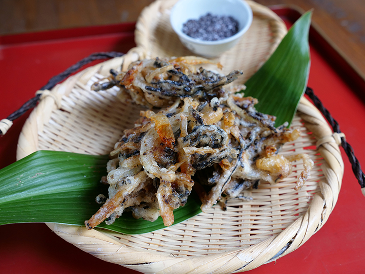 Mixed hijiki seaweed and sakura shrimp tempura with chopped hama natto features a crispy batter with the deep exquisite flavor of hama natto