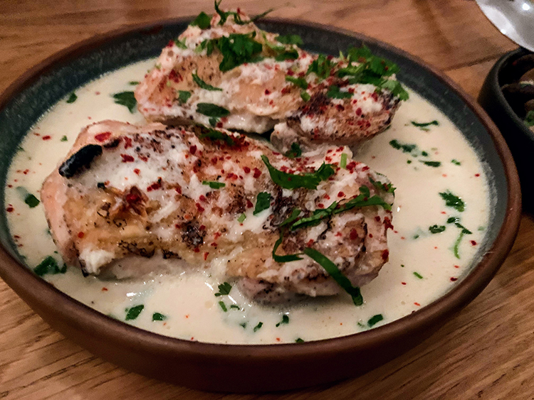 “It’s made by roasting a whole chicken, then simmering it in water with plenty of garlic and salt. Basically that’s it, though spices may be added. It’s served on an unglazed handmade dish, which is charming in its artlessness.”