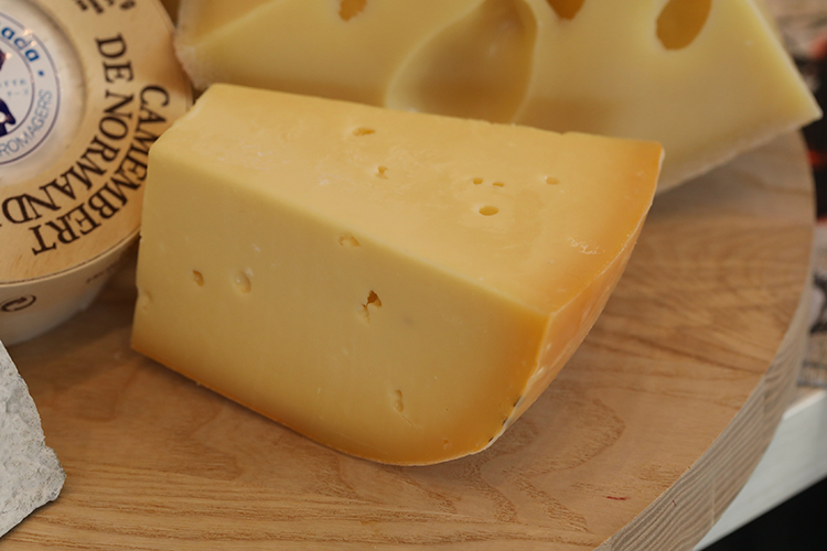 Semi-hard cheeses melt nicely when heated, have a pleasant texture, and are frequently used in cooking. The photo shows Gouda de Mai (Netherlands). The French Raclette and Reblochon AOC cheeses are also semi-hard types.