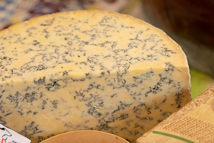 This type of cheese has the characteristic flavor and saltiness of Penicillium roqueforti mold. As the cheese ages, the flavor becomes sharper. The photo shows Blue Stilton (England). Other well-known blue-veined cheeses include Roquefort AOC (France) and Gorgonzola DOP. (Italy).