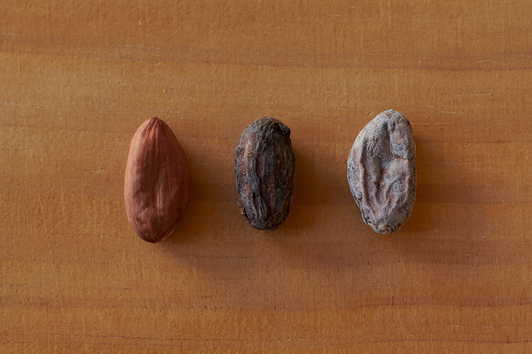 Unfermented cacao (left) and fermented cacao (center and right). The color and aroma change depending on which microorganisms are dominant. “What Whosecacao values the most is the Ginjo-saké-like aroma that arises from the cacao,” says Fukumura.