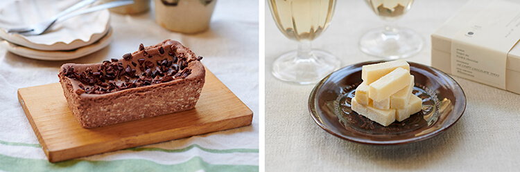 Fermented Terrine (left) lets you savor the rich fermented notes of two ingredients: cacao and cream cheese. Lingots Raw Chocolate (right) produced by nel Craft Chocolate Tokyo is marked by the vibrant aroma of undeodorized cacao butter.