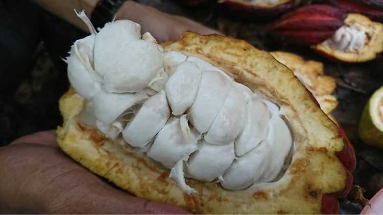 The inside of a cacao pod contains 30 to 40 beans encased in pulp (Photo courtesy of Whosecacao)