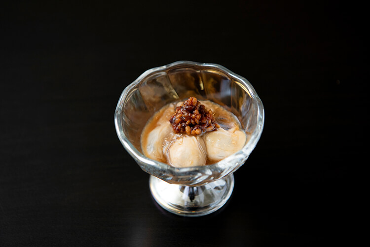 “This dish features oysters marinated in miso. The oysters are topped with brown-rice miso that we make with black soybeans. Oysters are often prepared with soy sauce-based fermented seasonings, but today I tried a miso base. This miso is low in salt. Since nearly all our customers drink saké, they love this small dish.”