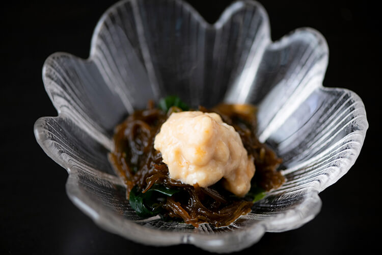“We use fresh mozuku, not the typical vinegared kind. Fermented seasonings like salted koji and saké lees bring out the most of the scallops’ umami flavoring. Together, the scallops pickled in saké lees and koji and the mozuku make a perfect pairing.”