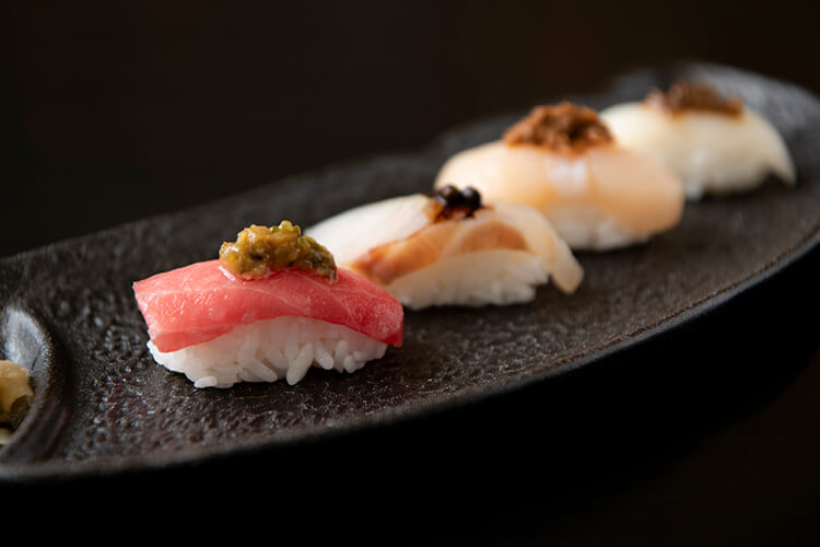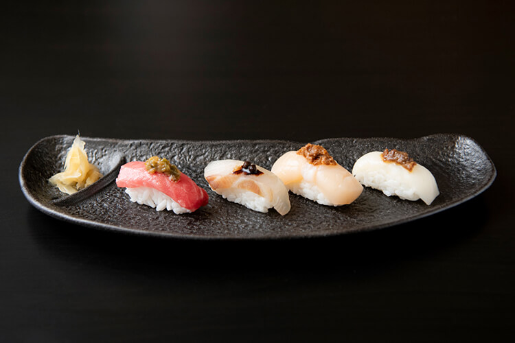 Kakuchi directs us to try the next piece of sushi: sea bream cured with kelp and topped with sansho peppercorns that have been pickled in soy sauce. Wondering what flavor this sushi will have, we take a bite. What washes over our taste buds is the umami from the sea bream enhanced by the kelp and the refreshing flavor of sansho.