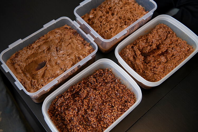 “When people make miso, they usually cover the miso with salt before closing the lid, but we cover the miso with saké lees instead. We spread a thick layer of saké lees on the freshly prepared miso. This prevents any air from coming in contact with the miso, so no mold will grow. Plus, you can eat all the saké lees. As the miso ferments, a liquid called tamari rises to the surface. The saké lees soaks up the tamari, and after one to two months, the originally white saké lees will turn brown. The saké lees we have today has been aging on miso for about eight months.”