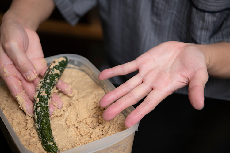 Kakuchi adds plain yogurt to his nukadoko to make it fluffier. The yogurt also makes the nukazuke taste milder and more refreshing.