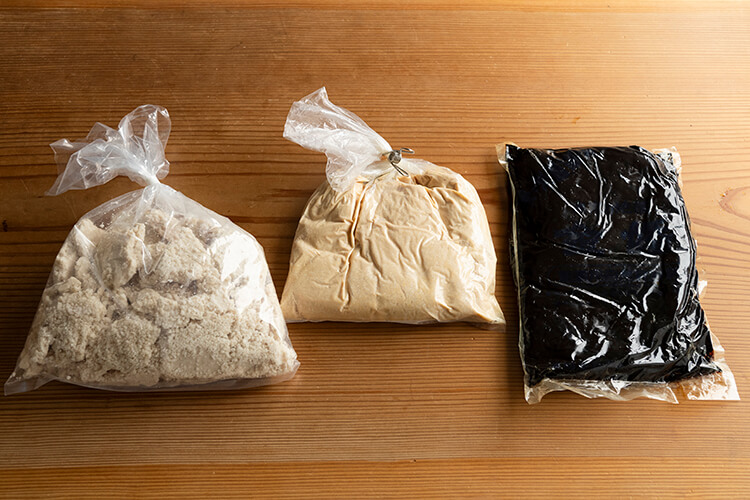 From left, bara-kasu, neri-kasu, and jukusei-kasu. Bara-kasu is the crumbled bits of saké lees left over when saké lees is pressed into sheets. Jukusei-kasu is saké lees that has been aged for an extra-long time and is used in pickling beds.
