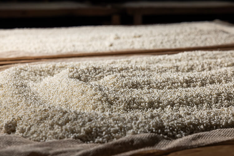 “Many breweries have stopped using wooden koshiki because of their lower thermal efficiency and the cost of maintaining them. Wood, nevertheless, is a sensible material with excellent heat retention and insulation properties, making it highly suitable for the steaming process. You can’t make good koji rice malt without steaming the rice properly first. What you aim for with rice that will be inoculated with koji mold is rice that is hard on the outside and soft on the inside. You can consistently achieve this ideal condition by steaming rice in koshiki.”