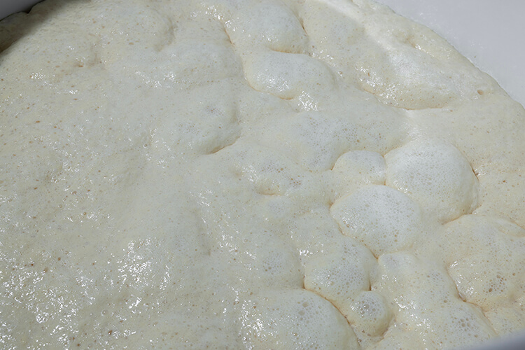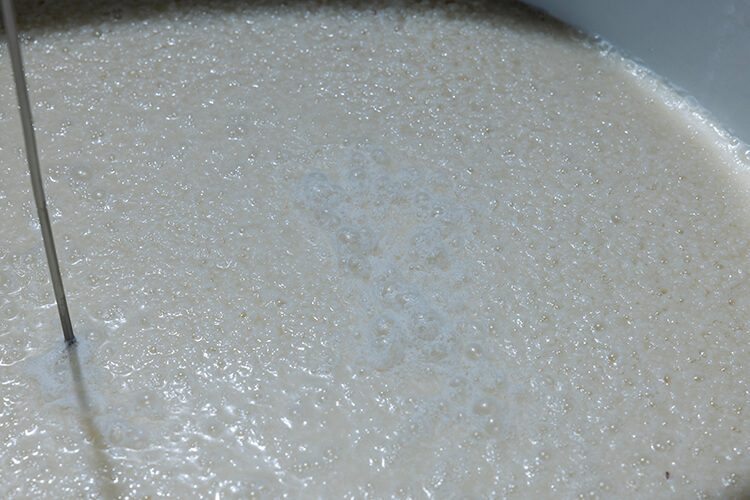 Yeast is propagated in a mixture of prepared koji, steamed rice, and water to cultivate yeast culture and create the shubo — the starter culture or mother of saké. There are two methods to make shubo: kimoto, which utilizes natural lactic acid bacteria residing in the brewery to eliminate unwanted bacteria, and sokujo-moto, which adds food-grade lactic acid bacteria to suppress unwanted bacteria and promote alcoholic fermentation. Nearly all breweries today use the sokujo-moto method; Sawada Shuzo has also been using the sokujo-moto method since the Meiji period (1868 to 1912). According to Sawada, few people know how closely involved Sawada Shuzo was in the development of the sokujo-moto technique.