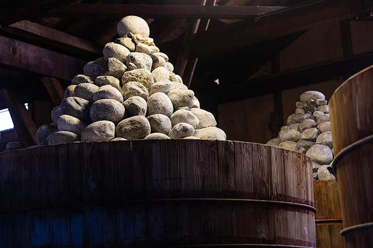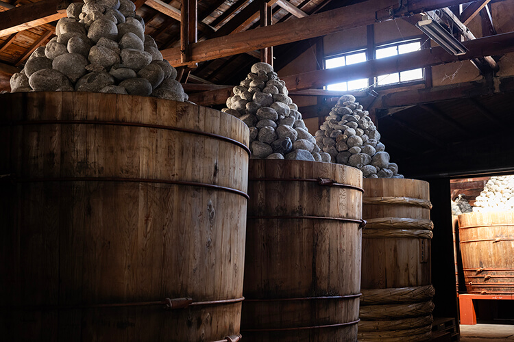 “After filling a wooden vat, we stack stones on top. For six tons of miso, we place three tons of stones on top, which works out to between 350 and 400 individual stones, both large and small. The sight of these stacked stones is unique to hatcho miso produced in the traditional way. Stacking this many stones is essential to making miso with low moisture content. If the miso has plenty of moisture, then you wouldn’t need this much weight.