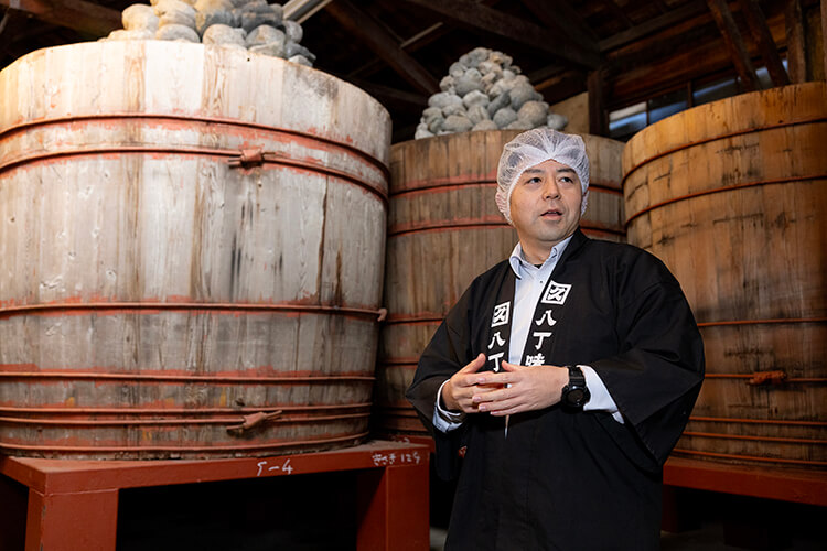 “After the stones have been stacked on top of the wooden vats, we let the miso age for over two years inside our wooden warehouse without temperature controls. Among all miso varieties, hatcho miso is aged for an extra-long time. We could speed up the process by aging it at a higher temperature, but our brewery is particular about letting our miso brew naturally. The delicious hatcho miso flavor is achieved by waiting for it to develop, slowly and naturally.”