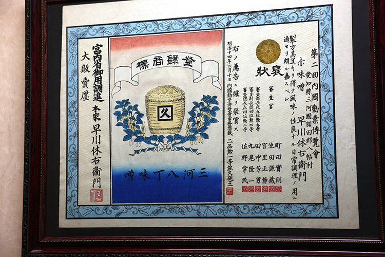 “While Tokugawa Ieyasu was serving as a retainer to Imagawa Yoshimoto [a daimyo feudal lord during the Sengoku period], an ancestor of the Hayakawa family, Hayakawa Shinrokuro Katsuhisa, was also a retainer to the Imagawa clan. After the Battle of Okehazama, in which the Imagawa clan was defeated, Lord Ieyasu barely escaped with his life to Daiju-ji temple in Okazaki. At the same time, Hayakawa Shinrokuro Katsuhisa fled to Gansho-ji temple in Okazaki. There, he gave up his samurai life, changed his name to Hayakawa Kyuemon, and learned miso-making. He later moved to Hatcho-mura [now incorporated in the city of Okazaki as Hatcho-cho] and founded the company in 1645.”