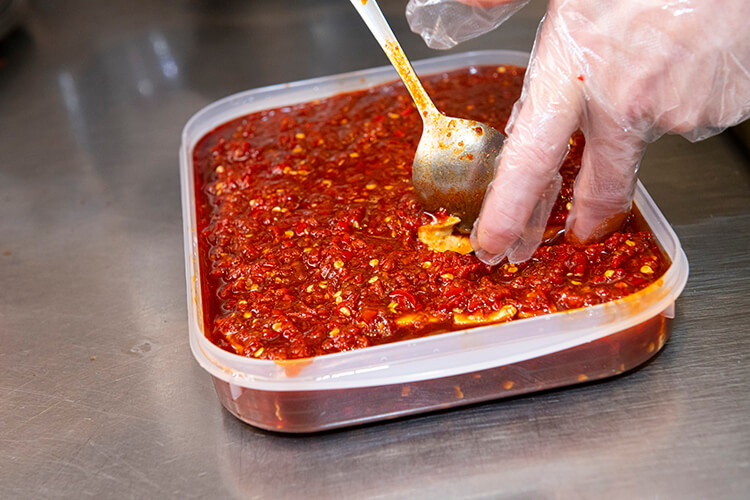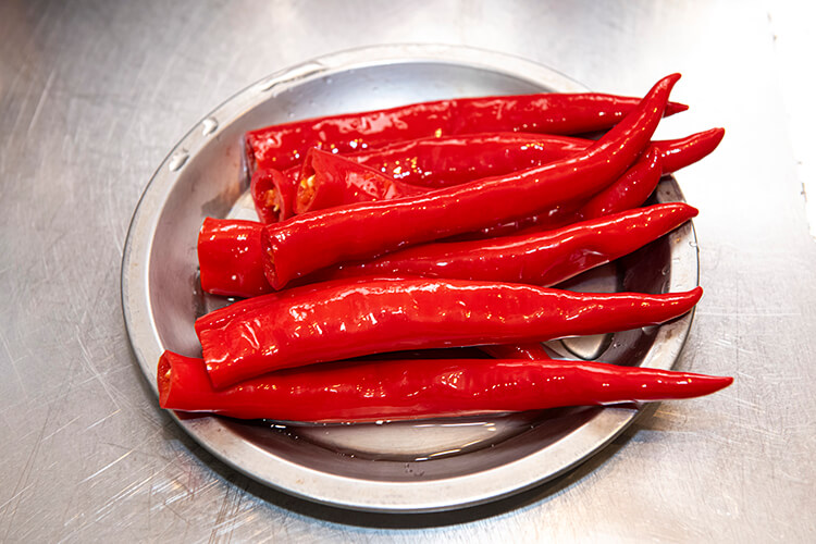 The fermented chili peppers in this recipe are made by removing the stems from red chili peppers and soaking them in salt water to ferment. Matsushima uses mildly spicy Korean red chilies.
