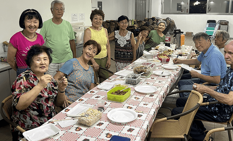 A gathering of Japanese descendants who brought such homemade cooking as simmered dishes, ohitashi boiled greens, and rice balls