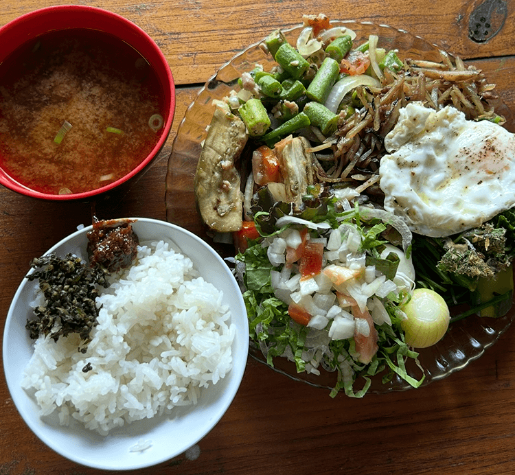 Lunch consists of rice, miso soup, salad, pickles, fried eggs, and simmered root vegetables