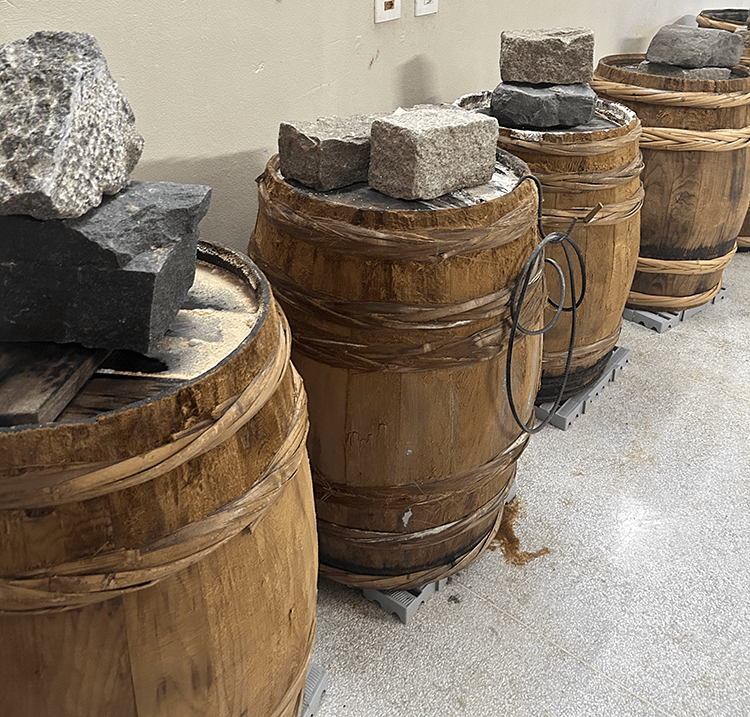 The miso ferments in wooden barrels for at least six months