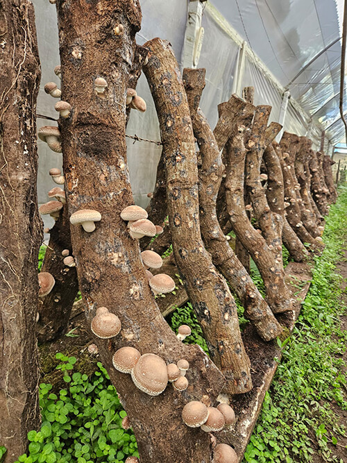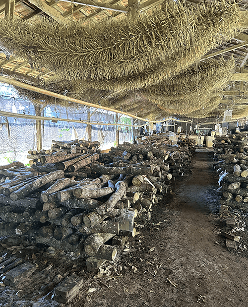 The shiitake spores are cultivated on the logs for about six months while regularly being watered