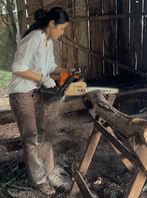 The mango trees are procured from an acquaintance’s field and cut into logs of a uniform length with a chainsaw. The log surfaces are cleaned and prepared for inoculation with shiitake spores.
