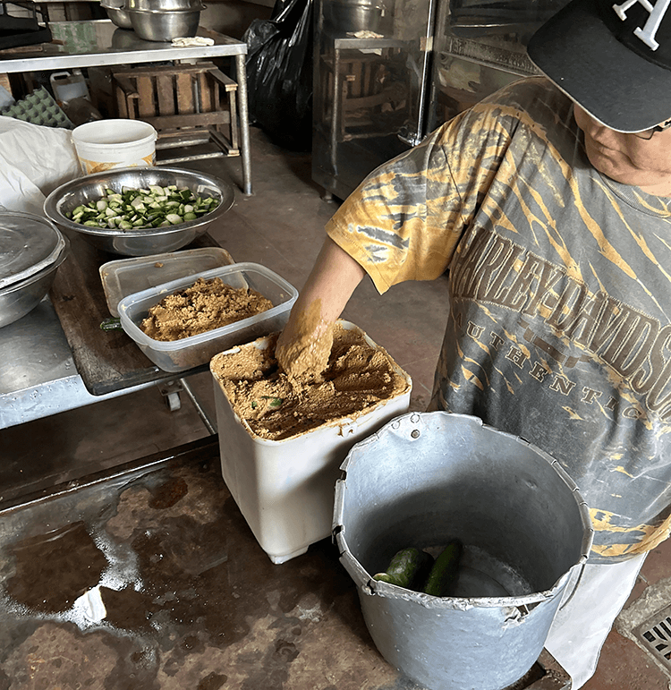 After mixing the carefully prepared rice koji, boiled soybeans, and salt, the miso is fermented in wooden barrels for at least six months. The barrels were originally made in Brazil for winemaking and have been passed down for generations. Some are over 100 years old, passed down from Hyo’s mother.