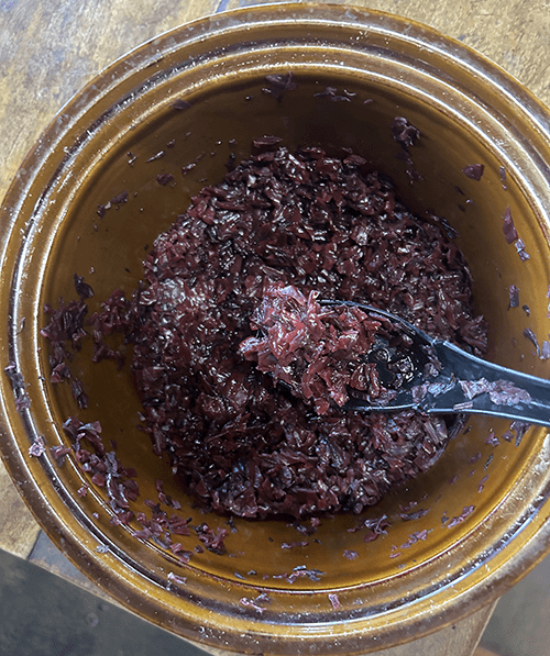 Particularly noteworthy are the so-called flower plums. These pickles are made from roselle, a plant related to hibiscus. Since plums are hard to come by in Brazil, roselle came to be used as a substitute for plums to make pickles similar to umeboshi. Pickled in salt, flower plums closely resemble traditional umeboshi in both appearance and taste. Their robust sourness and saltiness, combined with a subtle floral aroma, create a unique and compelling flavor profile, even without the addition of red perilla.