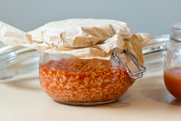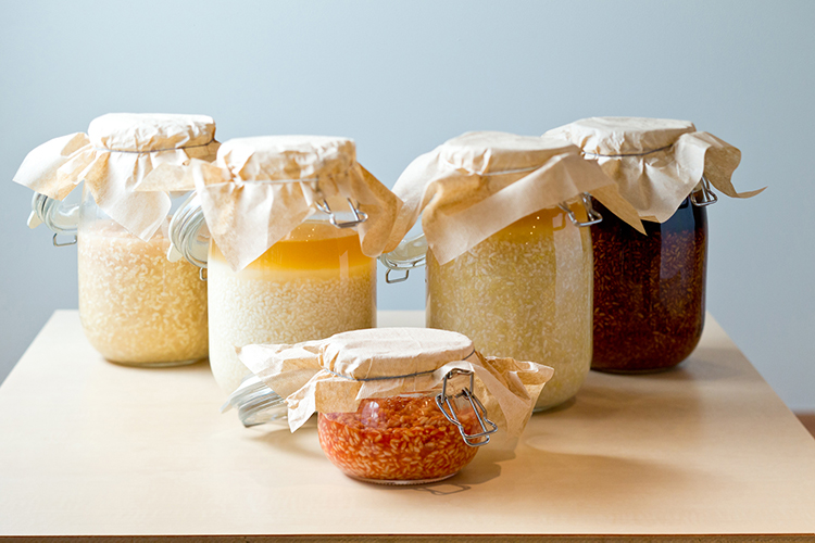 Some of the café’s koji seasonings in the process of fermenting. From the left, onion koji, salted koji, tomato koji, ginger koji, and soy sauce koji.