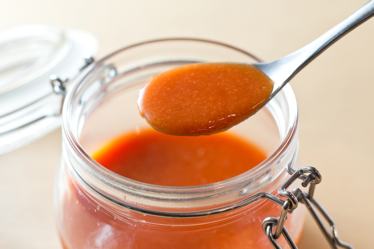 Koji seasonings take between 10 days and two weeks to complete the fermentation process, depending on the type. Once they are ready, mixing them in a blender creates a smooth, creamy texture. Tomato koji is shown in the photos.
