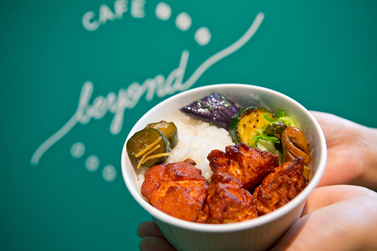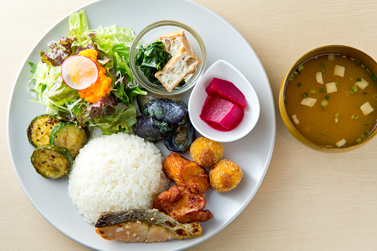 The café’s top recommendation is the Beyond One-Soup, Eight-Dish Homemade Koji Lunch. This lunch set menu features salted koji rice, one soup, and three regular dishes. (The soup is koji soup; the two main dishes are domestic chicken karaage marinated in four koji seasonings and grilled salmon in salted koji; and the side dish is a vegetable salad with koji dressing.) Completing the eight dishes are five Kyoto-style obanzai side dishes using various koji seasonings. The plate lunch is colorful, packed with vegetables, and nutritionally balanced. The obanzai dishes change daily, so it’s exciting to discover new flavors on each visit. Due to customer demand, the café now offers the lunch set menu to go. The takeout version is called Beyond Box and does not include the soup. It can be ordered in the evenings as well as during lunch.
