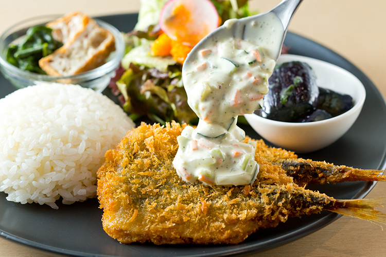 Another enjoyable in-store lunch option is the Special Plate, which includes salted koji rice and four dishes. In addition to the main dish and a vegetable salad with koji dressing, this special comes with two obanzai dishes made using koji seasonings. The main dish on the day of our visit was deep-fried horse mackerel. It was served with a tartar sauce packed with vegetables and made using salted koji. The sauce is light-tasting, and the texture of the vegetables adds a nice accent.