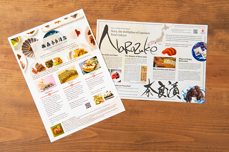 This English-language leaflet explains the history of Nara-zuke, their ingredients, and how they are made, as well as the best way to eat them. The leaflet is packed with thoughtful information for overseas guests trying Nara-zuke for the first time.