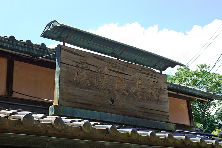 Left: The store’s sign that has been displayed since its founding. Made from a single plank of precious Kasuga-sugi cedar, the sign is so worn that the store’s name is now difficult to read. The characters were originally gilded with gold leaf.