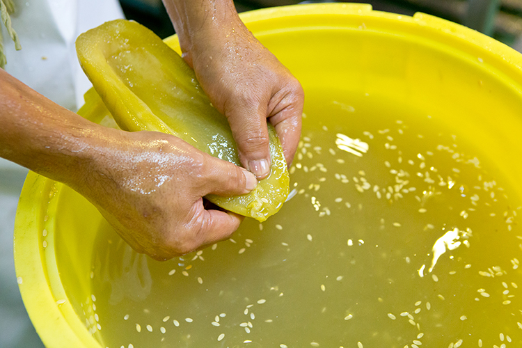 Right: The seeds are carefully washed off before proceeding to the next pickling step.