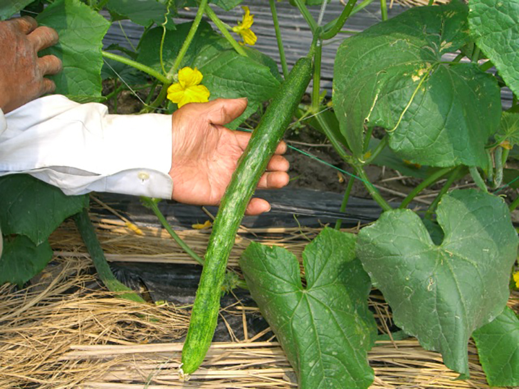 Heritage Yamato sanjaku cucumbers can grow to be over 40 centimeters long, making them challenging for distributors. But the fourth-generation owner, Mori Shigeru, who worked to revive the vegetable says, “These are vegetables born to be pickles.”