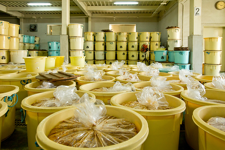 3. Second-stage pickling: Removes more saltiness from the shirouri and adds seasoning (saké lees from the third-stage pickling is reused)