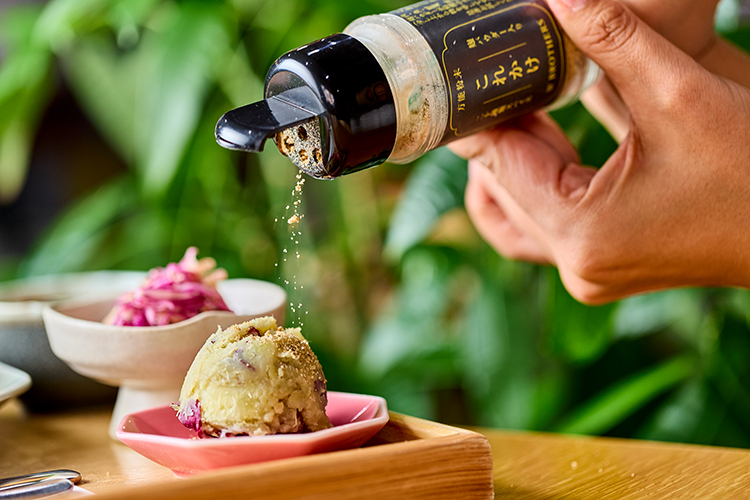 “Currently, the restaurant sells our line of all-purpose Korekake Spices with Koji Powder. In addition to plain, curry, and chili flavors, we occasionally offer limited-time flavors. For today’s special, I recommend sprinkling your favorite spice over the sweet potato salad. Low-Salt Umami Salted Koji, for example, is an unheated seasoning made with just fresh rice koji, salt, and water and fermented at a low temperature. Not only is it packed with enzymes, it has less salt than commercial products, which means meat marinated in the seasoning won’t burn easily when grilled. You can use it in dressings as well as on meat or fish. We are working on developing smoothie mixes along with more original seasonings such as All-Purpose Soy Sauce Koji and Fresh Sweet Koji.”