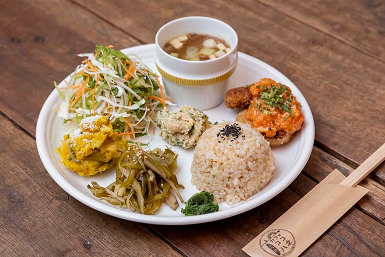 “For example, the main croquette dish is made with several varieties of beans and topped with a sauce consisting of saké lees and tomato. Side dishes include dishes with veggie meat, along with wakame seaweed stems, hijiki seaweed, mushrooms, and other items rich in dietary fiber and minerals. We design the overall meal to be balanced nutritionally. For dressings, we use homemade umeboshi [pickled plums] vinegar, lacto-fermented onions, and achar pickles. In addition to miso soup, we serve potage in summer and stews in winter, changing things up to keep them interesting. Even the hamburger buns are homemade with natural yeast. During the new moon, we serve noodle dishes inspired by soul foods from around the world. In this way, we are always experimenting and refining our menu.”