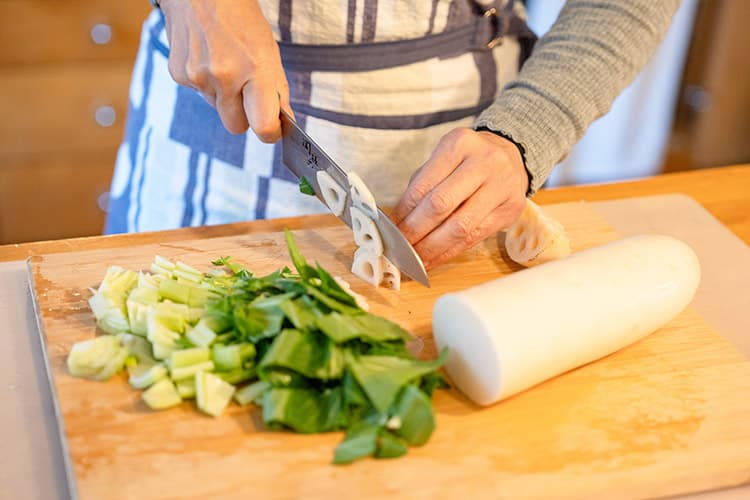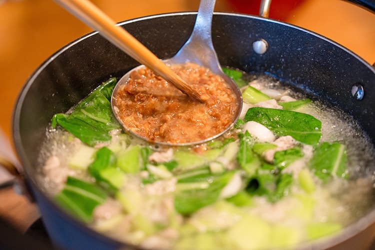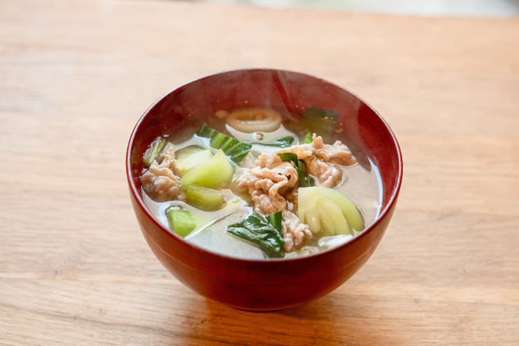 Ishizawa made us a miso soup she recommends for February. She stir-fried pork, then added lotus root, daikon radish, and ginger, simmering the ingredients gently in water. She finished the soup off by adding bok choy, white scallions, and miso.